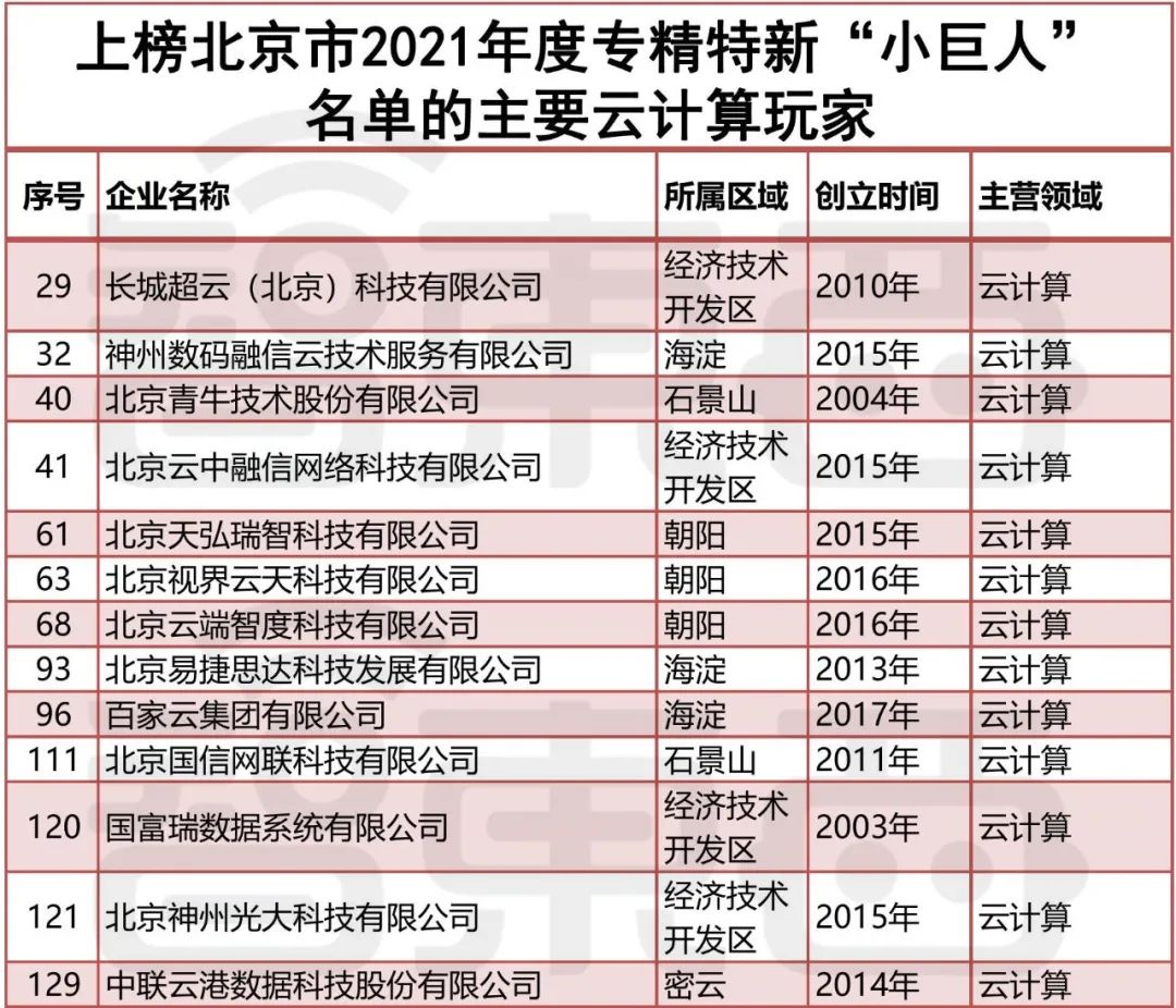 與數(shù)據(jù)息息相關(guān)的是計(jì)算,在2021年北京專(zhuān)精特新“小巨人”名單中,云計(jì)算領(lǐng)域的企業(yè)達(dá)到13個(gè)。