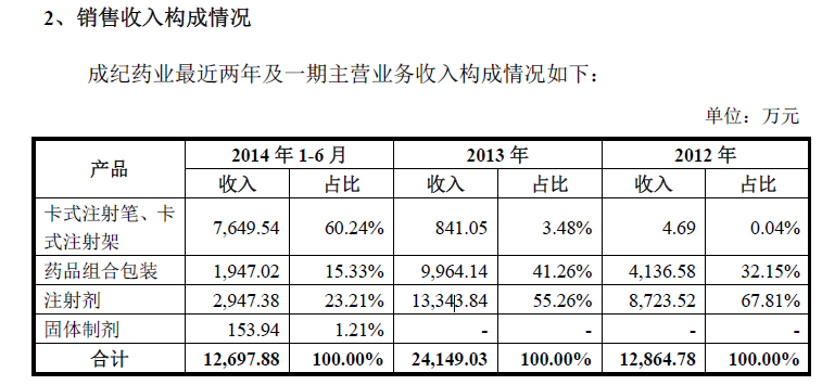 我們看到,2012年,成紀(jì)藥業(yè)的營(yíng)業(yè)收入中,主要是注射劑和藥品組合包裝,其中注射劑占比為67.81%,注射筆和注射架銷售金額僅4.69萬元,占比僅為0.04%,2013年和2014年上半年,注射筆和注射架貢獻(xiàn)的收入異軍突起,到14年上半年,在營(yíng)收結(jié)構(gòu)中占比已經(jīng)高達(dá)60.24%。
