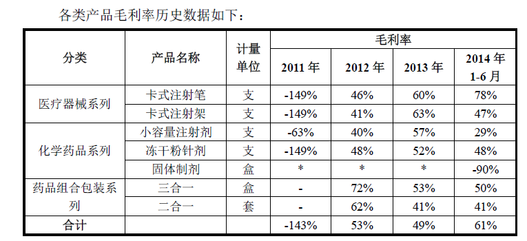 2012年到2014年上半年,成紀(jì)生物的綜合毛利率從53%上升至61%,其中化學(xué)藥和組合包裝產(chǎn)品毛利率下降趨勢(shì)明顯,驅(qū)動(dòng)其綜合毛利率大幅走高的,主要是注射筆。根據(jù)其報(bào)告書披露,主要是14年上半年公司開發(fā)的二代注射筆投入市場(chǎng),而這種產(chǎn)品的毛利率,高達(dá)85%。