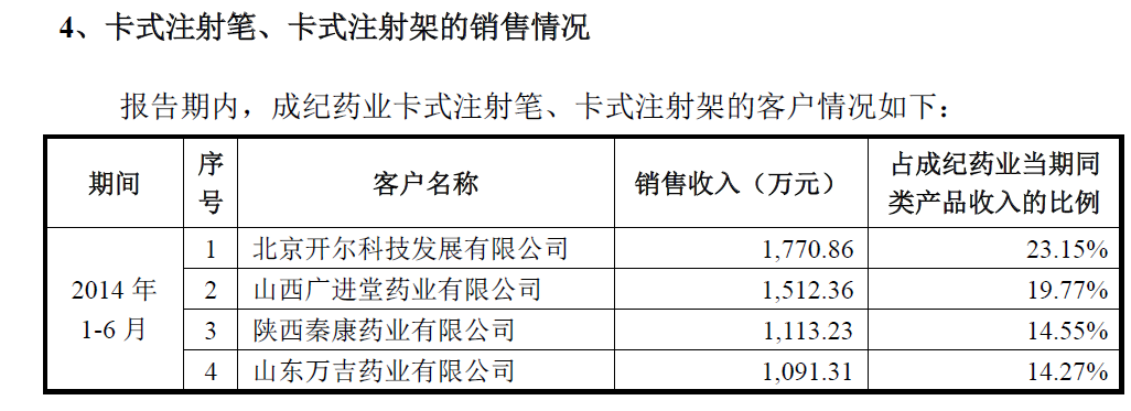 第一大客戶是北京開爾科技發(fā)展有限公司(下稱“開爾科技”),2014年1-6月銷售金額1770.86萬元。工商資料顯示,該公司成立時(shí)間為2014年5月7日,也就是說,它成立不到2個(gè)月,即成為成紀(jì)藥業(yè)注射筆、注射架的第一大客戶。