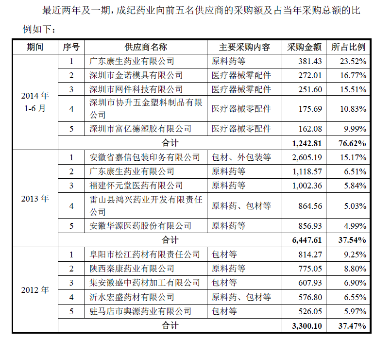 下面再來看成紀(jì)藥業(yè)2012年至2014年上半年的前五大供應(yīng)商: