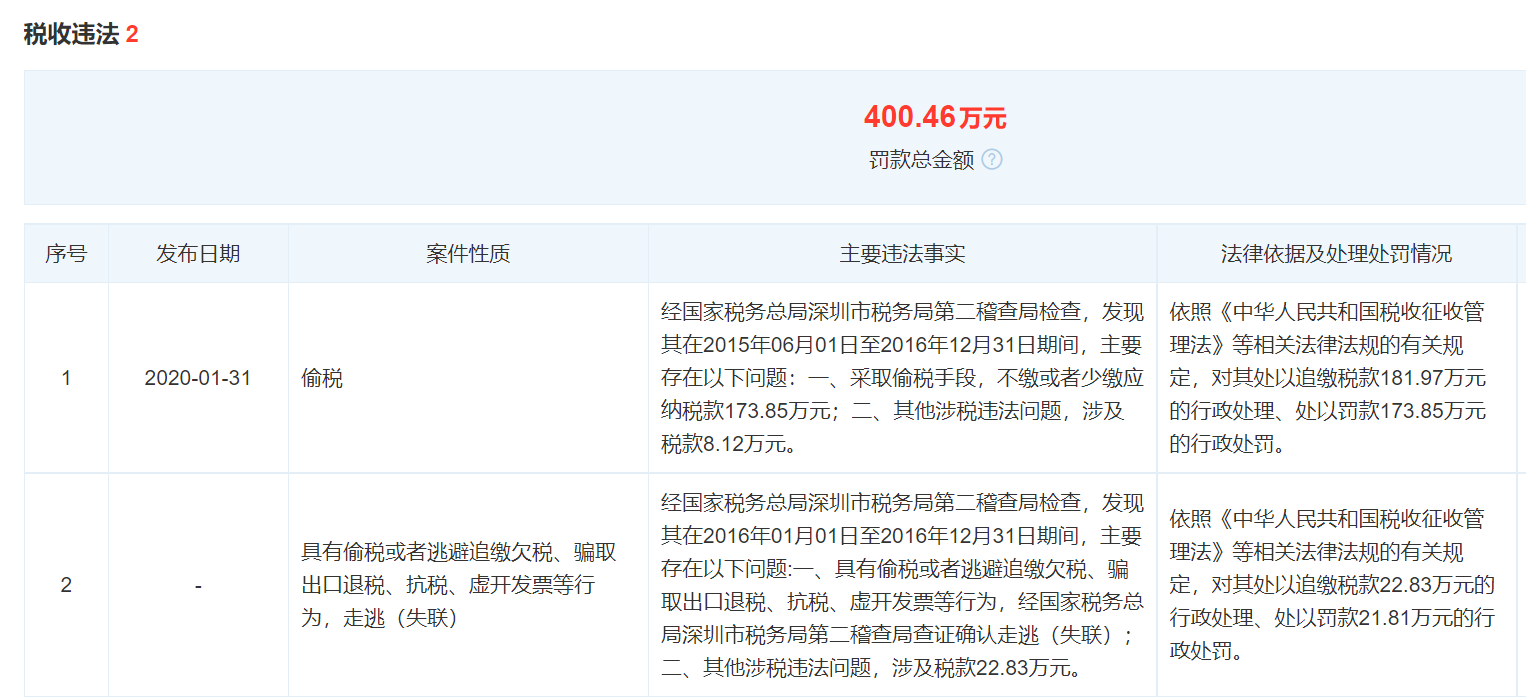 第三大供應(yīng)商深圳市網(wǎng)件科技有限公司,該公司2013年7月11日才成立,目前營(yíng)業(yè)執(zhí)照已被吊銷。網(wǎng)件科技存在嚴(yán)重的偷稅行為,其偷稅行為主要發(fā)生在2015年和2016年,于2020年被稅務(wù)局罰款400余萬元,具體情況如下: