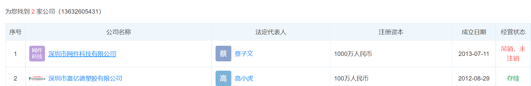 第五大供應(yīng)商深圳市富億德塑膠有限公司,這家公司倒是仍然存在,似乎看起來沒什么異常,不過,在工商信息里,這家公司與第三大供應(yīng)商深圳市網(wǎng)件科技有限公司共用過同一個(gè)電話號(hào)碼。