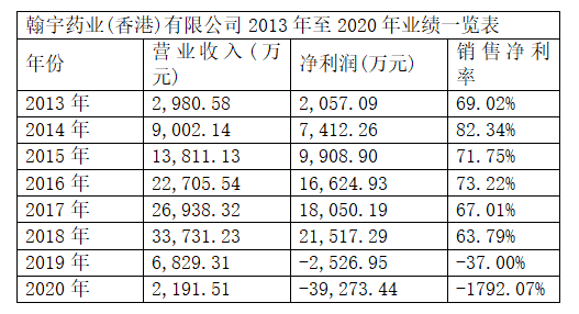 翰宇香港不僅營(yíng)收增長(zhǎng)迅猛,盈利能力更是驚人,以下是公司2013年至2020年的主要財(cái)務(wù)業(yè)績(jī):