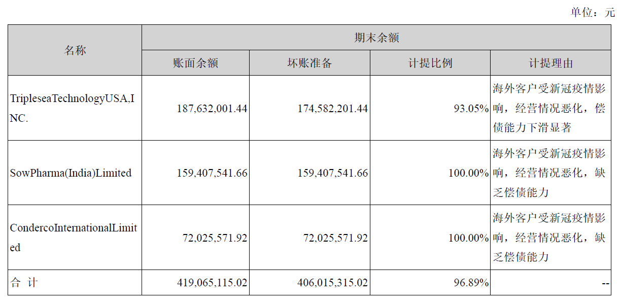 2020年,翰宇藥業(yè)一口氣計(jì)提應(yīng)收賬款壞賬損失高達(dá)4.25億元,問題主要就出在翰宇香港的海外客戶上,三家海外客戶計(jì)提的壞賬準(zhǔn)備金額高達(dá)4.06億元,其中2020年計(jì)提了3.51億。