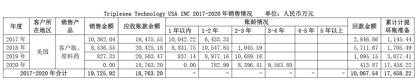 2017年至2019年,翰宇香港向Triplesea technology USA. INC公司銷售金額分別為10,362.04萬元、8,536.55萬元及827.33萬元,合計(jì)銷售金額1.97億元。而截止到2019年,應(yīng)收賬款余額為2.05億,從賬齡分布來看,這三年的銷售都沒有回款。