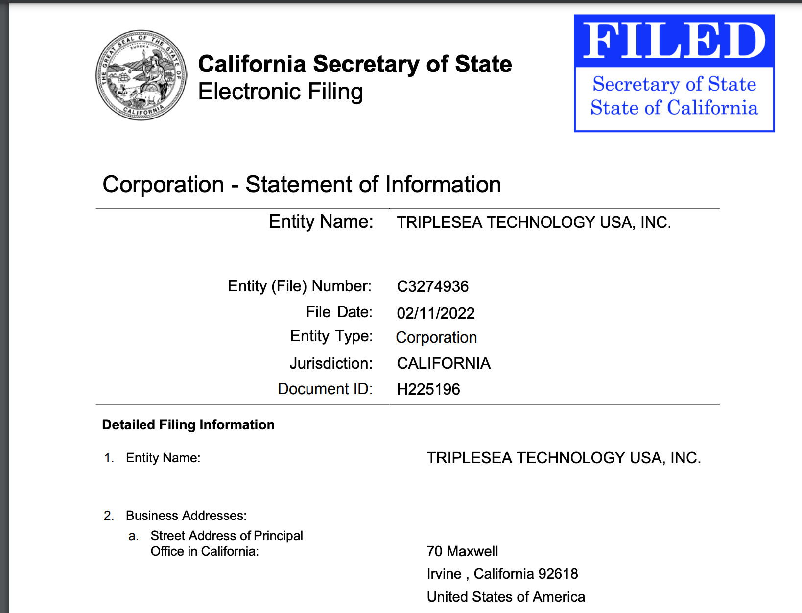 清流工作室發(fā)現(xiàn),Triplesea technology USA. INC是一家注冊(cè)在美國(guó)加州爾灣的貿(mào)易公司,成立于2010年;公司的CEO、秘書、CFO長(zhǎng)期有一名為“Haizhou Zhao”的華人擔(dān)任,公司2017年的報(bào)表填寫人是“Sanyou Chen”;也就是說,實(shí)際上可能是個(gè)華人企業(yè);