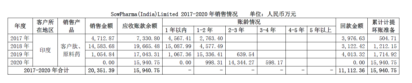 2017年至2019年,翰宇香港對(duì)SowPharma(India)Limited銷售金額分別是4,712.87萬元、14,583.68萬元、1,054.84萬元,合計(jì)金額2.04億元。