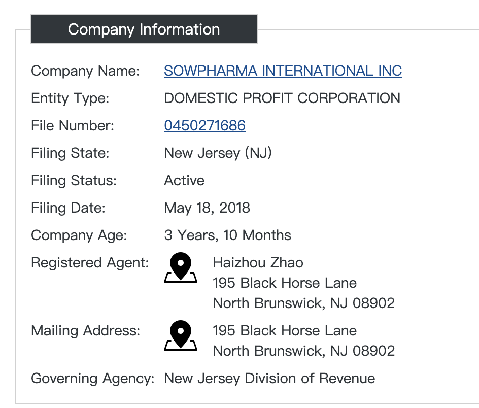 有趣的是,遠(yuǎn)在美國(guó)紐澤西,有一家名為SOWPHARMA INTERNATIONAL INC的公司,卻有公開信息顯示,該公司的注冊(cè)人是一個(gè)叫“Haizhou Zhao”的人士——與前述美國(guó)客戶Triplesea的管理人員同名。
