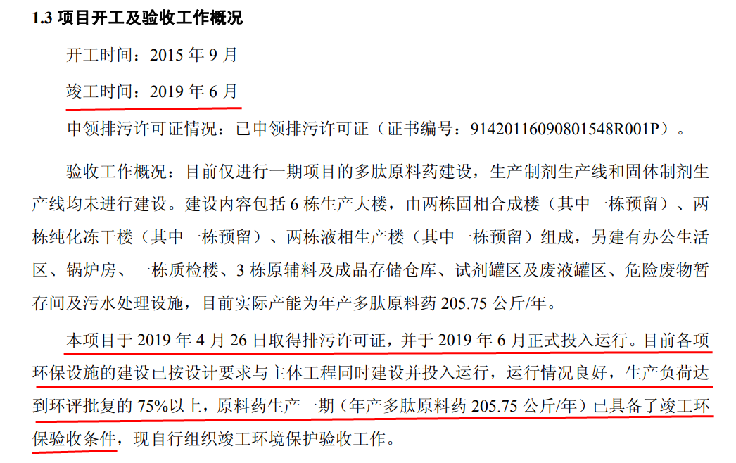 清流工作室在翰宇藥業(yè)官網(wǎng)上找到一則《翰宇藥業(yè)(武漢)有限公司生物醫(yī)藥生產(chǎn)基地建設(shè)項(xiàng)目一期竣工環(huán)境保護(hù)驗(yàn)收監(jiān)測(cè)報(bào)告》,報(bào)告顯示,該項(xiàng)目實(shí)際上在2019年6月已經(jīng)正式投產(chǎn):
