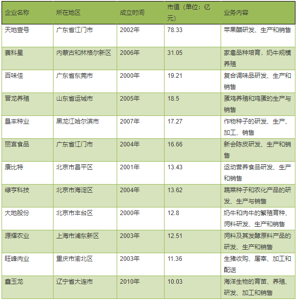 表1:創(chuàng)新層中市值10億以上的農(nóng)業(yè)食品公司 來源:新三板,截至日期為2月28日