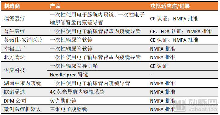 其次,包括熒光內(nèi)窺鏡、3D內(nèi)窺鏡等在內(nèi)的內(nèi)窺鏡也均有新發(fā)展。這些內(nèi)窺鏡以腹腔鏡為主,可用于泌尿外科場(chǎng)景;功能上主要向著成像更清晰、識(shí)別病灶更精準(zhǔn)的方向發(fā)展。目前在這些創(chuàng)新內(nèi)窺鏡領(lǐng)域,國(guó)內(nèi)企業(yè)均有布局。而結(jié)合新技術(shù)的創(chuàng)新內(nèi)窺鏡也正是國(guó)產(chǎn)品牌對(duì)進(jìn)口品牌的超車彎道。