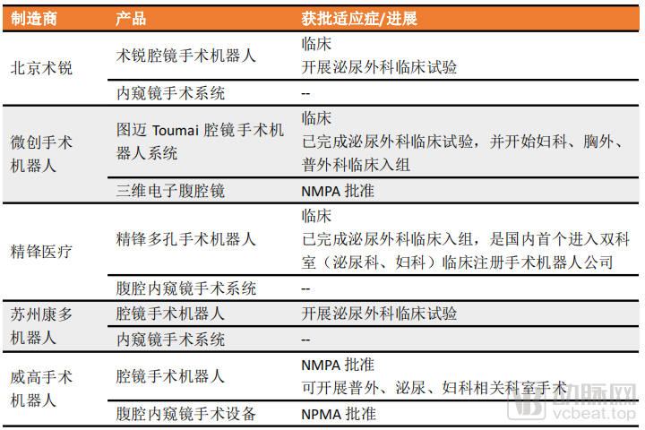 據(jù)悉,目前我國(guó)市場(chǎng)上已有多家腹腔鏡手術(shù)機(jī)器人在獲批、臨床等不同階段。其中已獲批的威高手術(shù)機(jī)器人可用于普外、泌尿、婦科相關(guān)科室手術(shù);微創(chuàng)機(jī)器人、精鋒醫(yī)療、術(shù)銳、康多等多家機(jī)器人也已經(jīng)相繼開展泌尿外科臨床試驗(yàn)。