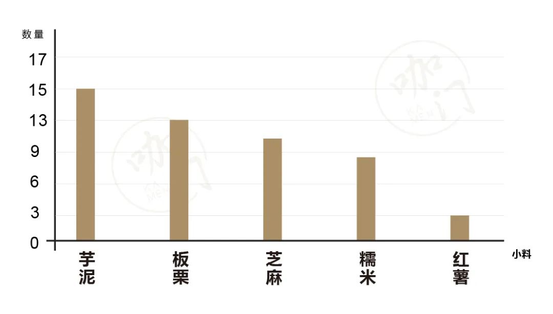 統(tǒng)計奶茶中使用到的小料數(shù)量,芋泥使用數(shù)量依舊最多,有15款,其次是板栗,共有13款,芝麻共出現(xiàn)了10次。