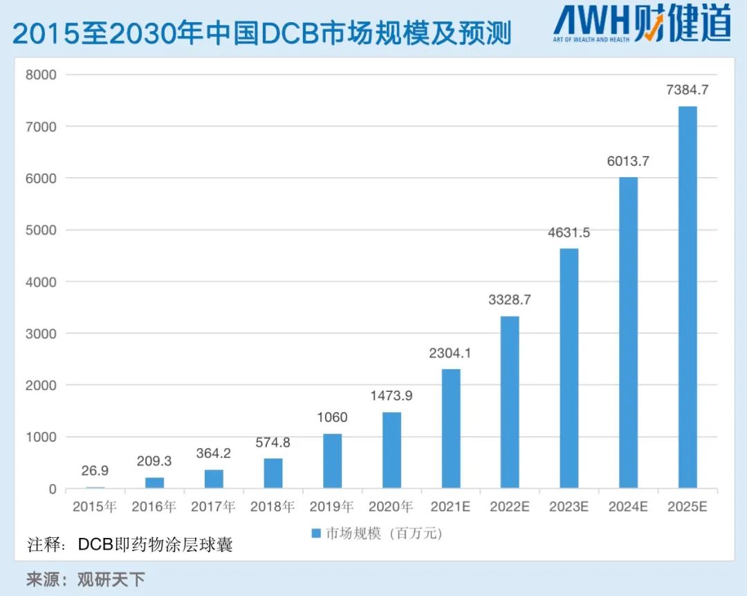 冠脈支架集采落幕3周之后,鐘東波轉(zhuǎn)任北京市衛(wèi)健委黨委書記、副主任。其后一年間,杯葛冠脈支架集采成果的對(duì)策也迅速被找到,替代支架的藥物球囊(DCB)用量直線上升,市場規(guī)模從2015年的2690萬元(均價(jià)2萬元左右)增長至2020年的14.73億元。盡管從2015年以來,藥物球囊一直持續(xù)性增長,但以國采(2019年)為分水嶺,此后的增長速度遠(yuǎn)超前5年,據(jù)觀研報(bào)告網(wǎng)預(yù)測,2025年其市場規(guī)模可達(dá)73.85億元。由此可見,藥物球囊搖身一變,成為香餑餑。