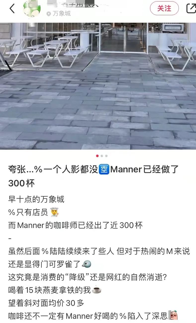 在小紅書上,我看到有博主分享:“早上10點(diǎn)的萬象城,網(wǎng)紅%還一個(gè)人沒有的時(shí)候,Manner咖啡師已經(jīng)出杯300了”。