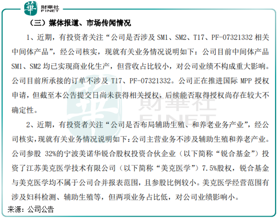 到了3月12日,美諾華在股價異常波動公告中表示,公司目前中間體產(chǎn)品SM1、SM2均已實現(xiàn)商業(yè)化生產(chǎn),但營收占比較小,對公司業(yè)績不構(gòu)成重大影響。
