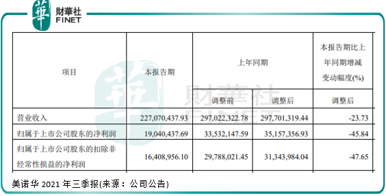 在2021年三季度,美諾華營收同比下滑23.73%至2.27億元,凈利潤更是大幅下降45.84%至0.19億元。
