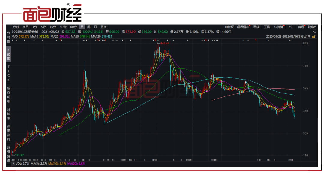 近日,愛美客發(fā)布2021年年報(bào)。與公司翻番業(yè)績(jī)不相符的是,愛美客股價(jià)自去年下半年以來一路震蕩下跌。截至3月17日收盤,愛美客的股價(jià)較去年高點(diǎn)跌去了超40%,市值蒸發(fā)近逾800億元。
