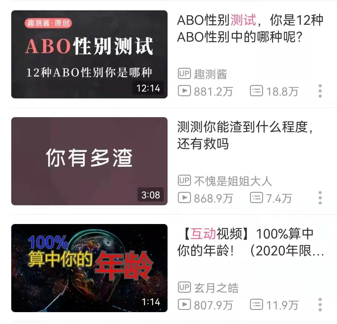 或許是B站上火熱的互動(dòng)視頻,測(cè)試“你的ABO信息素味道?”“你的犯罪智商有多高?”“你的命定戀人是哪種類型?”,這些測(cè)試無需花費(fèi),但是卻為up創(chuàng)造了源源不斷的播放量和流量。