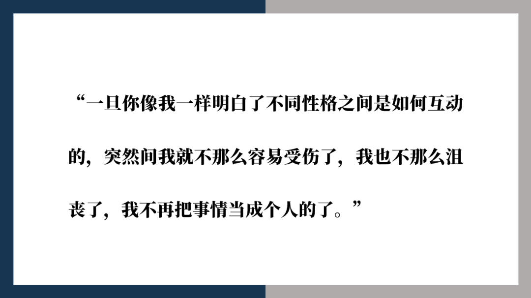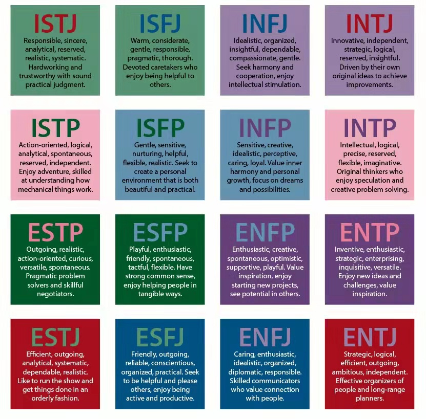 一方面,MBTI類型并不能為人描繪一副完整的個(gè)性版圖,但它卻提供了一個(gè)框架和跳板,讓人們思考自己和他人的特性、差異、關(guān)系。人們無法生存在MBTI的幻想之中,但通過調(diào)整組織,改善細(xì)節(jié),卻能夠不斷豐滿生活,或走向自己的理想人格。