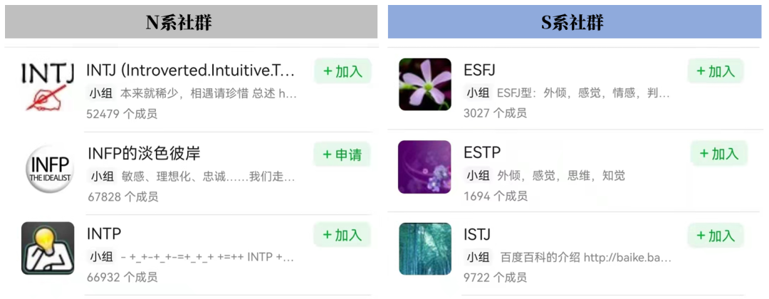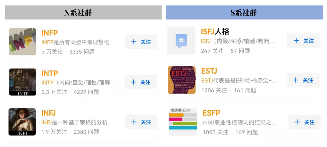 首先,MBTI的分類標(biāo)準(zhǔn)固化了MBTI虛擬世界的層級(jí)模式,也由此推動(dòng)了MBTI文化的討論和維系。在知乎、豆瓣、微博等社交平臺(tái)上,N系(即直覺型人格)的關(guān)注者、活躍度遠(yuǎn)高于S系(即實(shí)感型人格),intp/intj/infp/infj/enfp/entp等人格幾乎把持著MBTI世界的話語體系和解釋權(quán)力。這固然是因?yàn)镾系的人格往往活躍于現(xiàn)實(shí)生活,對(duì)MBTI不了解也不感興趣,但客觀上卻造成了MBTI中鄙視鏈?zhǔn)⑿?,?yōu)越感突出。而這種矛盾和爭議也推動(dòng)了MBTI文化的興起。