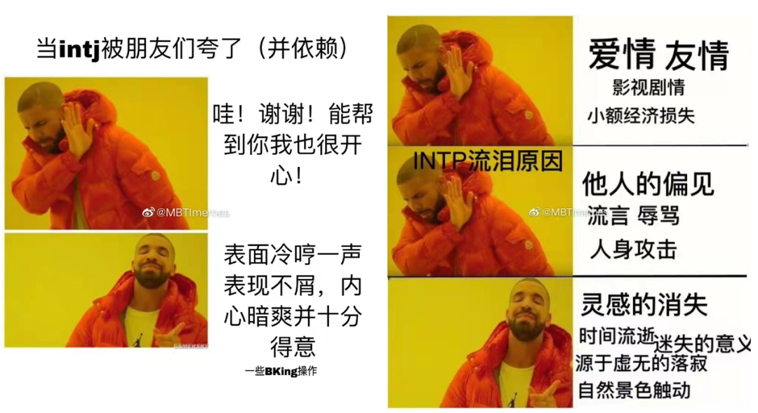 其次,MBTI對(duì)于十六型人格的描述具有極端化、固定化、具象化的特點(diǎn),這就非常適合人們代入或創(chuàng)作。一方面,互聯(lián)網(wǎng)Meme成了MBTI文化發(fā)聲和玩梗的重要表達(dá)形式,另一方面,很多小說和同人創(chuàng)作中直接應(yīng)用MBTI類型來強(qiáng)化主角人設(shè),比如intj是特立獨(dú)行的天才、infp是吟游四海的藝術(shù)家、entj是一呼百應(yīng)的大眾情人、isfj是安靜內(nèi)斂的守護(hù)者……
