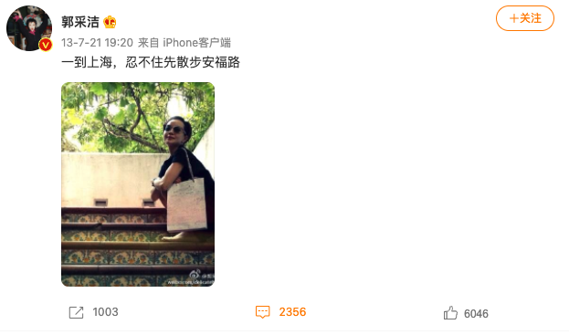 郭采潔的微博一定程度上代表著各類文藝青年對上海安福路的喜愛。2019年前,如今的網(wǎng)紅馬路安福路還沒有這么大的名氣,當新消費品陸續(xù)搶占入駐后,往日尚叫“巨潑來斯路”時的繁鬧又浮現(xiàn)了出來。