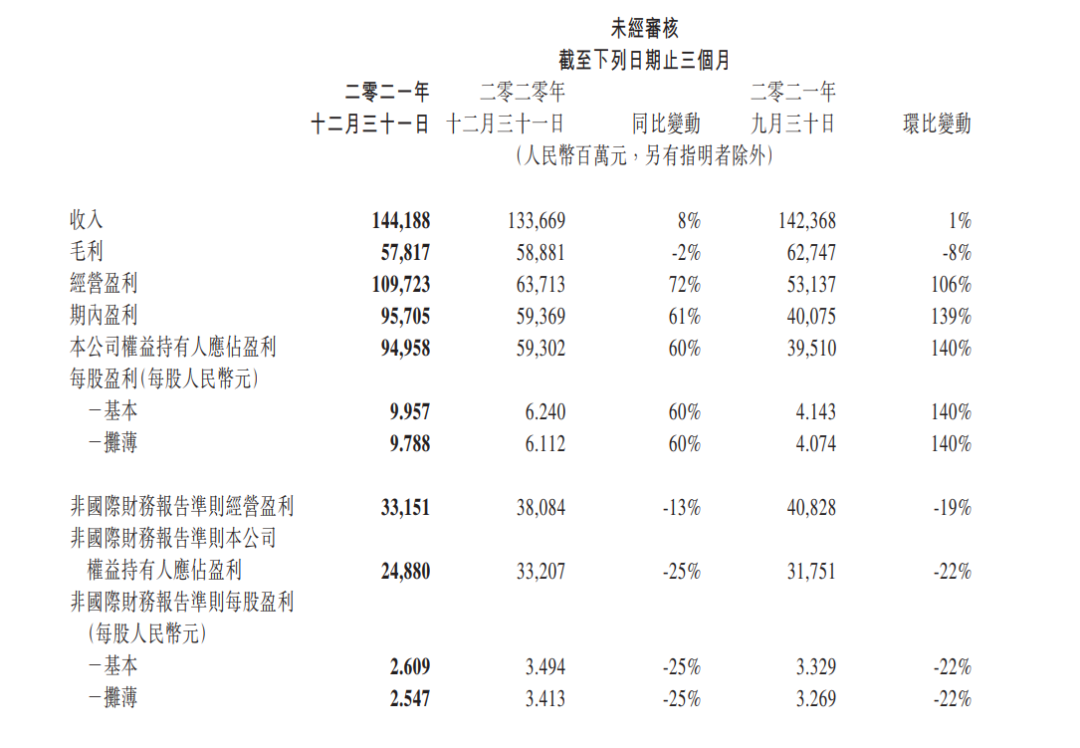 3月23日,騰訊發(fā)布2021年Q4及全年財報顯示。財報顯示,第四季度,騰訊總收入為1442億元,同比增長8%,本公司權(quán)益持有人應(yīng)占盈利為950億元,同比增長60%。