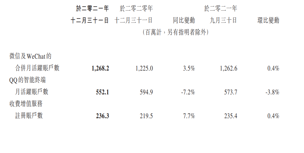 截止2021年12月31日,微信及Wechat的合并月活為12.68億,同比增長3.5%,環(huán)比增長0.4%。