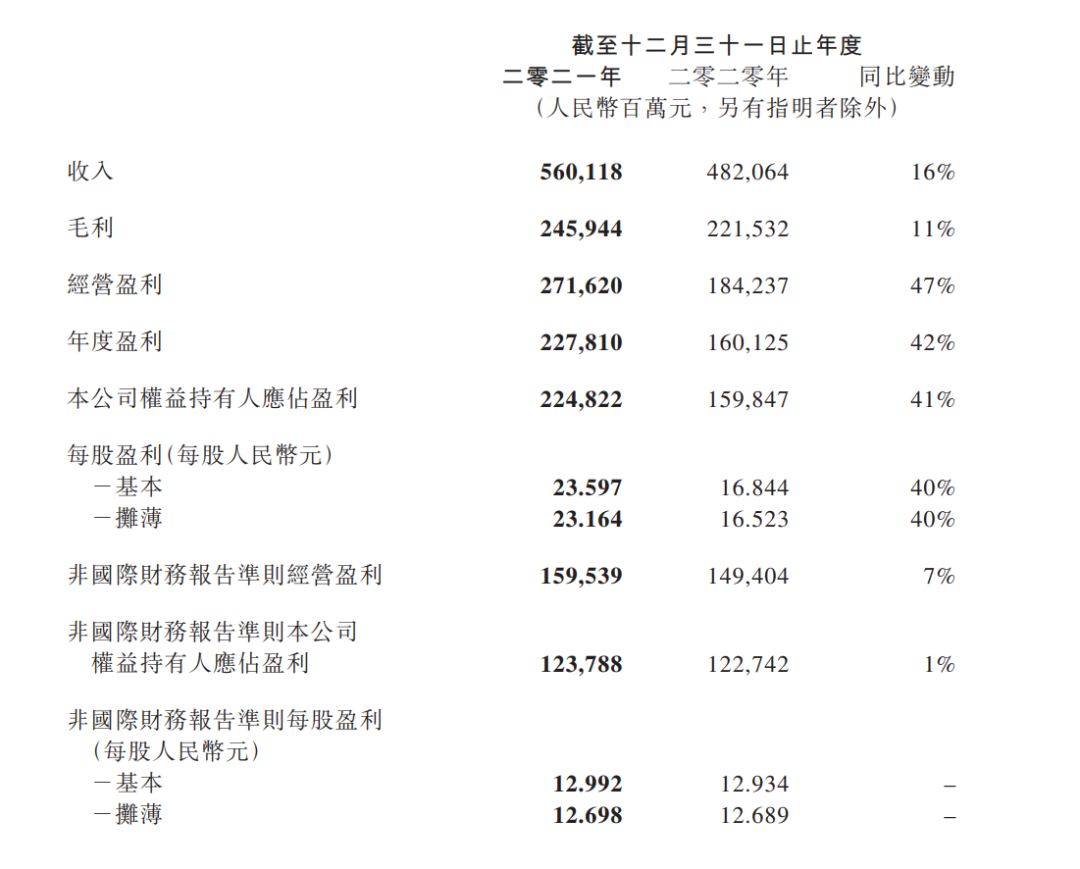 回到全年,騰訊在2021年總收入為5600億元,同比增長16%,本公司權(quán)益持有人應(yīng)占盈利為2248億元,同比增長41%。除去包括處置京東集團(tuán)股份收益782億元在內(nèi)的投資等因素,經(jīng)調(diào)整后應(yīng)占盈利為1238億元,同比僅微增長1%。