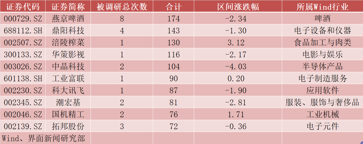電子部件與設備為本周最為熱門的板塊。Wind行業(yè)數據顯示,該板塊有9家上市公司獲得機構調研,其次是工業(yè)機械板塊和電子元件板塊,均有8家上市公司獲機構調研;此外,服裝、服飾與奢侈品、基礎化工板塊本周均有5家上市公司獲得機構調研。