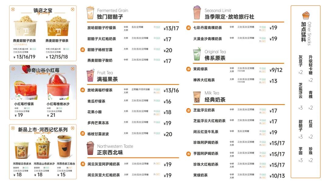 以放哈為例,在以甜醅子奶茶走紅上海后,并沒有將思維局限在蘭州、甘肅,而是制定了“將河西走廊物產(chǎn)飲品化”的思路,將河西杏皮水、灰豆子、漿水、凍梨等一系列西北小吃,用新茶飲的方法改良,積累了300個(gè)SKU。