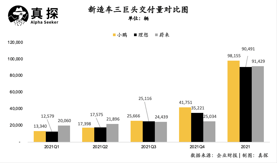 2021年第四季度,小鵬的交付量突破4萬(wàn)達(dá)到41751輛,環(huán)比增長(zhǎng)幅度高達(dá)63%。理想同樣以40.2%的高環(huán)比增長(zhǎng),在2021年最后一個(gè)季度交付了35221輛車(chē)。相比而言,蔚來(lái)的增長(zhǎng)就顯得十分緩慢,季度交付量?jī)H有25034輛,環(huán)比增幅只有2.4%。整個(gè)2021年,蔚來(lái)沒(méi)有一個(gè)季度的交付量超過(guò)三萬(wàn)。