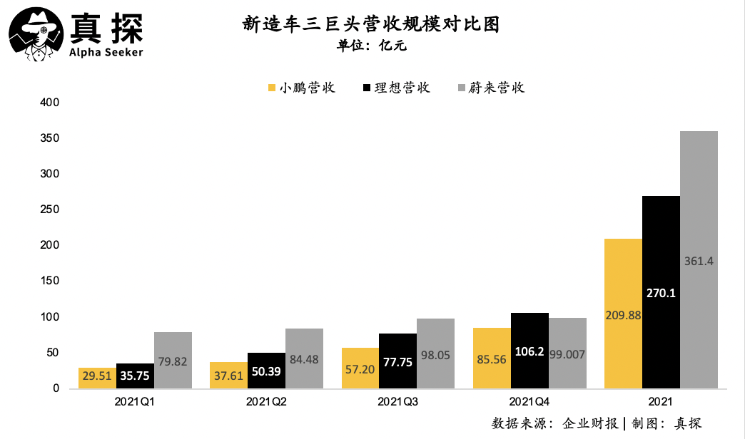 2021年全年,蔚來(lái)營(yíng)收為361.4億,同比增長(zhǎng)為122.3%,理想次之總營(yíng)收為270.1億,漲幅達(dá)到185.6%,小鵬同比上漲幅度最大,達(dá)到了259.1%,不過(guò)由于基數(shù)較小,總營(yíng)收位列第三為209.88億元。