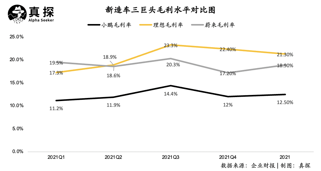 在總體毛利率層面,理想基本保持在20%上下排在第一,2021年全年毛利率水平達(dá)到21.3%,蔚來(lái)緊隨其后為18.9%,小鵬始終在15%以下,2021年全年為12.5%。