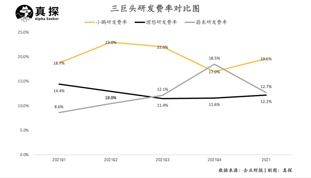 在研發(fā)投入方面,蔚來(lái)排在第一,2021年全年達(dá)到45.91億元。小鵬位列第二,達(dá)到41.14億元,三家之中理想最為精打細(xì)算,研發(fā)投入僅為32.9億元,與其他兩家差距不小。而在研發(fā)費(fèi)用率方面,小鵬依然居首,19.6%的研發(fā)投入比遠(yuǎn)高于理想的12.18%和蔚來(lái)7.3%。