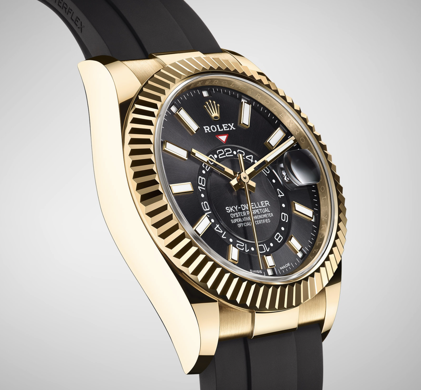 2022年勞力士ROLEX發(fā)布的全新蠔式恒動縱航者型(Oyster Perpetual Sky-Dweller)18CT黃金款,被稱為精湛技術(shù)與簡易操作的完美結(jié)合,采用勞力士自動上鏈機械機芯;搭載高性能Paraflex緩震裝置;雙時區(qū)顯示,易于讀取且便于操作。與以往最大的不同是配備了Oysterflex 表帶,高性能黑色橡膠表帶,搭配亮黑色太陽光線效果表盤、18ct 黃金指針及鐘點標記。表殼及表耳兩側(cè)折射出淡雅光澤,令42毫米蠔式表殼的輪廓更突出,