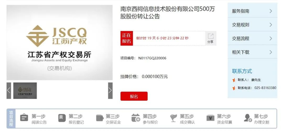近日,江蘇產(chǎn)權(quán)市場(chǎng)網(wǎng)發(fā)布了一則股份轉(zhuǎn)讓交易公告。公告顯示,南京西祠信息技術(shù)股份有限公司(下稱“西祠公司”)以0.0001萬元(即1元)的掛牌價(jià)格轉(zhuǎn)讓500萬股股份。