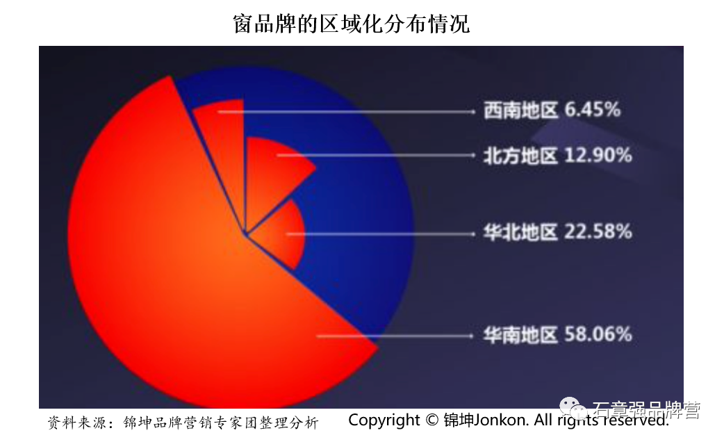 (3)第三點,就要講到品牌的建設(shè)。當前窗的品牌區(qū)域化明顯,缺乏全國性代表品牌。從數(shù)據(jù)中得出,華南地區(qū)是聚集區(qū)域,其他區(qū)域的門窗品牌也在逐步興起。越是在這樣百花齊放的階段,區(qū)域內(nèi)的品牌也會逐漸呈兩極分化的態(tài)勢,行業(yè)競爭的加劇,以及市場對產(chǎn)品要求的提升,導(dǎo)致的必然結(jié)果是品牌強者逾強,弱者逾弱。