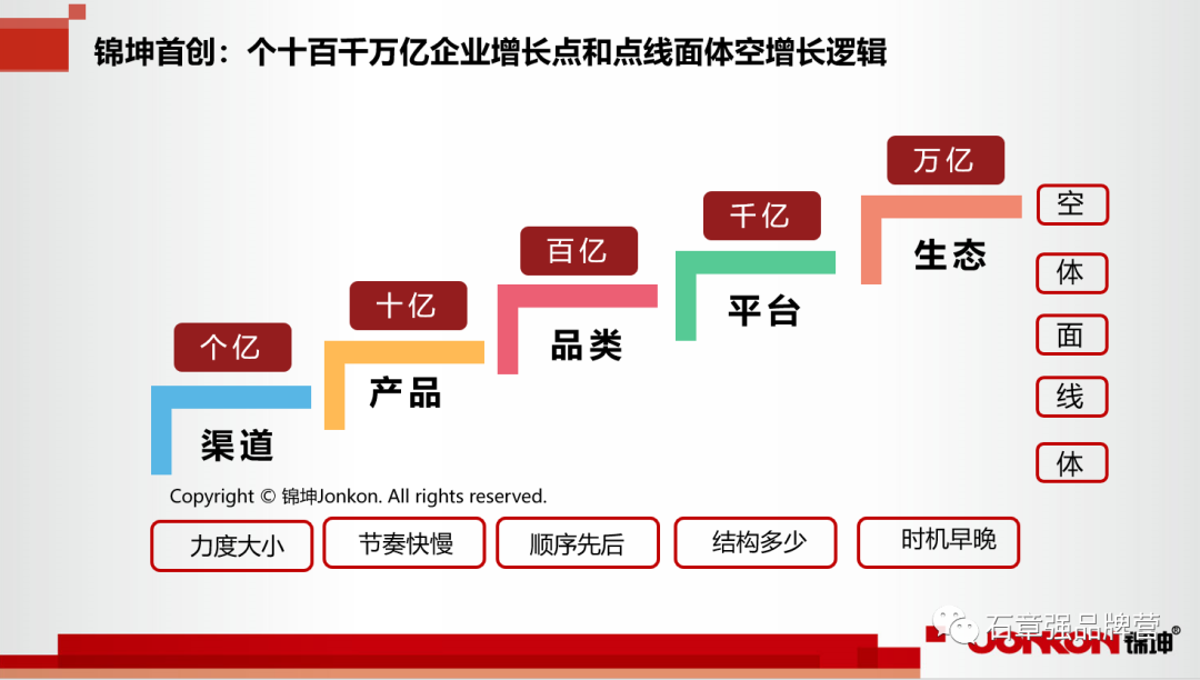 對于個億級企業(yè),增長點的核心在于產(chǎn)品。只有把產(chǎn)品在同等質(zhì)量上做的比別人價格低或者同等價格下質(zhì)量比別人好,企業(yè)才具備增長的潛力。如果產(chǎn)品關(guān)沒做好,其他的動作越多就越快倒下。再往上走,十億級、百億級、千億級和萬億級的核心增長點分別就變成了渠道、品類、平臺和生態(tài)。
