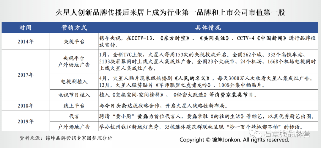 我們以營銷“打得一手好牌”的火星人為例,深知對于新興品類而言,有限的消費者認知往往限制著銷售量的快速擴張,品牌往往需要通過營銷推廣來教育市場,因此火星人營銷高舉高打,旨在提升品類認知度。自2010年起,各大集成灶品牌也開始加大營銷,讓更多消費者了解到集成灶品類。最終營銷方面的投入解釋了火星人營收規(guī)模的快速增長,也讓火星人彎道超車趕超老牌廠家進入市場份額前列、行業(yè)第一品牌和上市公司市值第一股的陣營。