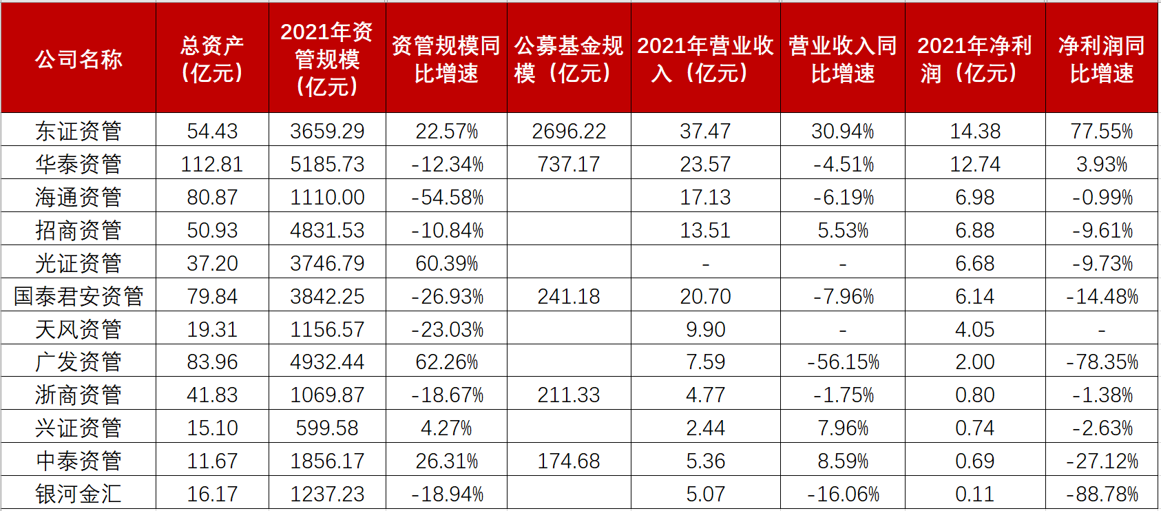 除此之外,另外7家公司資管規(guī)模出現(xiàn)不同程度的下滑。海通資管下滑尤為明顯,2021年資管規(guī)模同比減少54.58%,國泰君安資管、天風(fēng)資管同比減少20%以上。