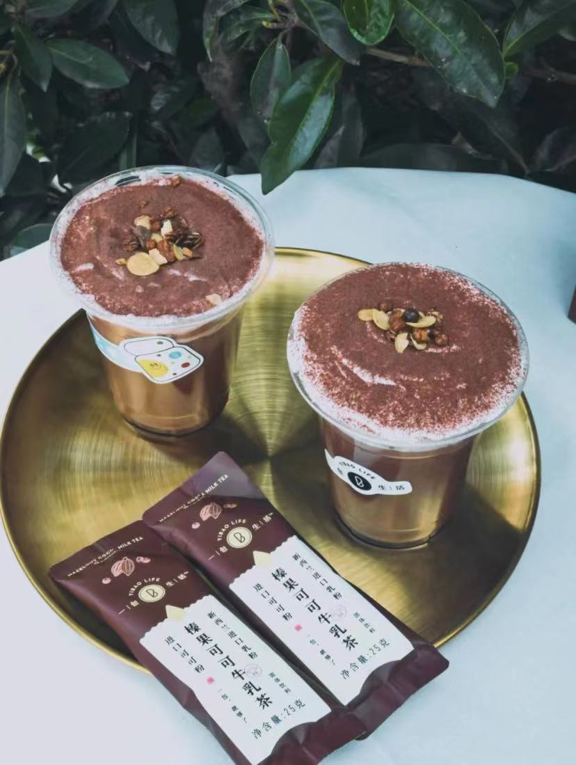 秋冬季主推榛果可可牛乳茶,強(qiáng)化其美味和暖胃的屬性。此外,提前將奶粉和可可粉混合,以便消費(fèi)者直接用水沖泡也不會(huì)影響飲品的口感。