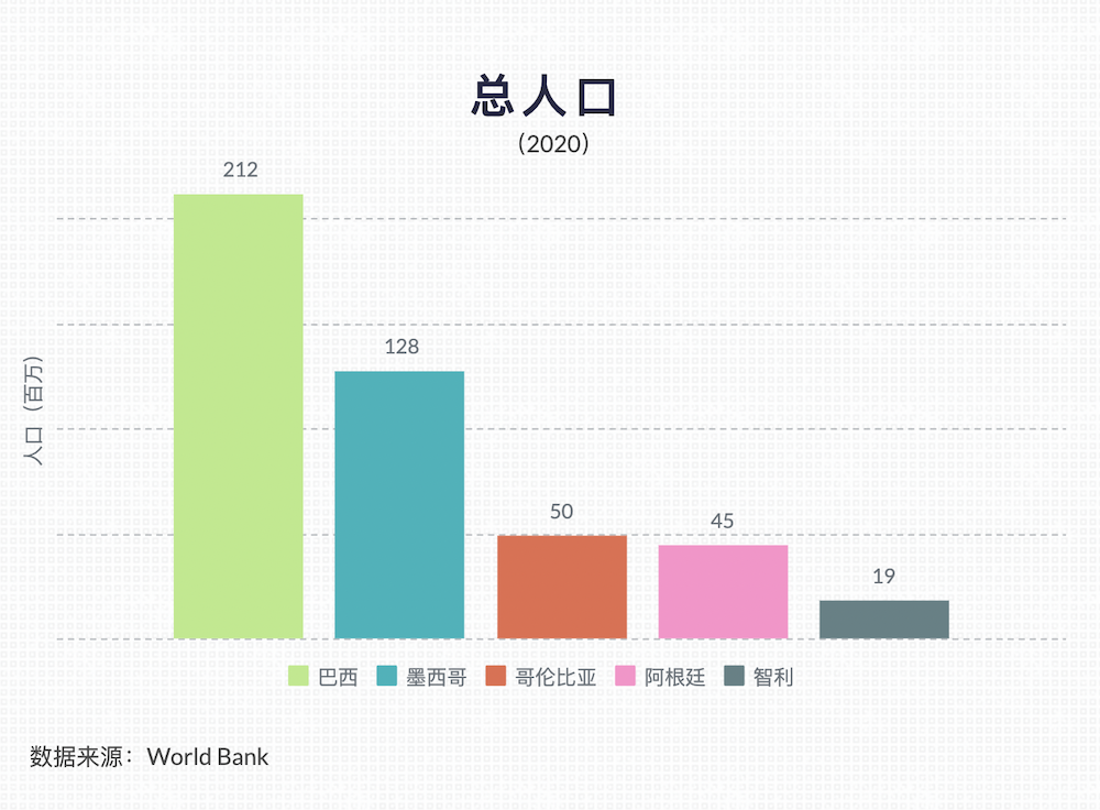 據(jù)世界銀行2020年的數(shù)據(jù)統(tǒng)計(jì),巴西人口約2.1億,是拉美地區(qū)人口最多的國(guó)家,人口數(shù)量是墨西哥、哥倫比亞、阿根廷和智利等拉美主要市場(chǎng)的數(shù)倍。此外,巴西也是一個(gè)高度城市化的國(guó)家,城市人口占總?cè)丝跀?shù)的87%。城市化排名在上述拉美主要市場(chǎng)中位列第三,僅次于阿根廷(92%)和智利(88%)。