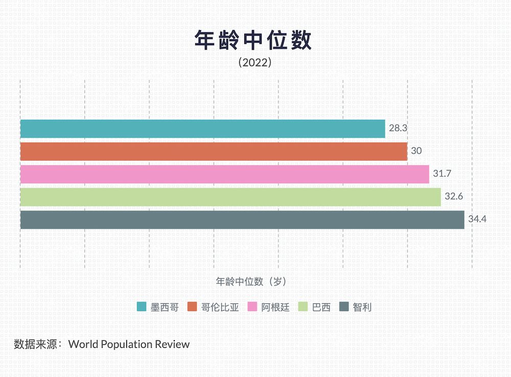 同時(shí),拉美也是一片相對(duì)“年輕”的大陸。根據(jù)世界人口綜述(World Population Review)2022年的數(shù)據(jù),巴西的年齡中位數(shù)為32.6歲,是上述拉美主要市場(chǎng)中較“老”的國(guó)家。不過(guò)仍舊比歐洲四大經(jīng)濟(jì)體(年齡中位數(shù)平均40歲)和中國(guó)(37.4)要年輕不少。