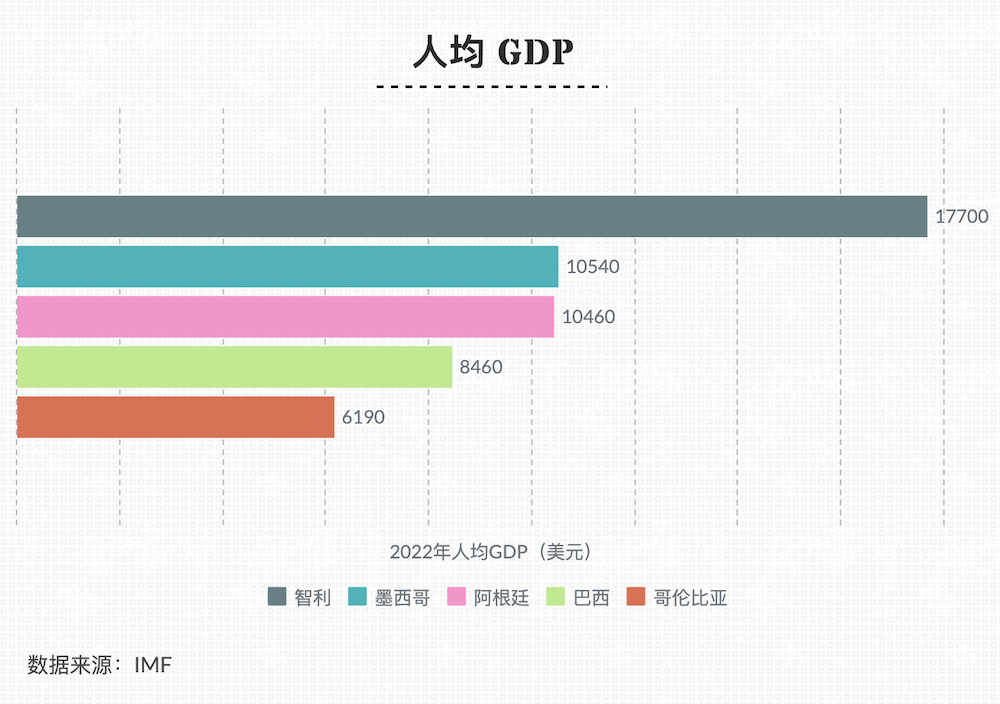 巴西人民生活水平方面,從人均 GDP 來(lái)看,根據(jù) IMF 2022 年數(shù)據(jù)顯示,該國(guó)人均 GDP 為8460美元。相較于智利、墨西哥、阿根廷和哥倫比亞,巴西的人均 GDP 倒數(shù)第二,僅高于哥倫比亞的6190美元。