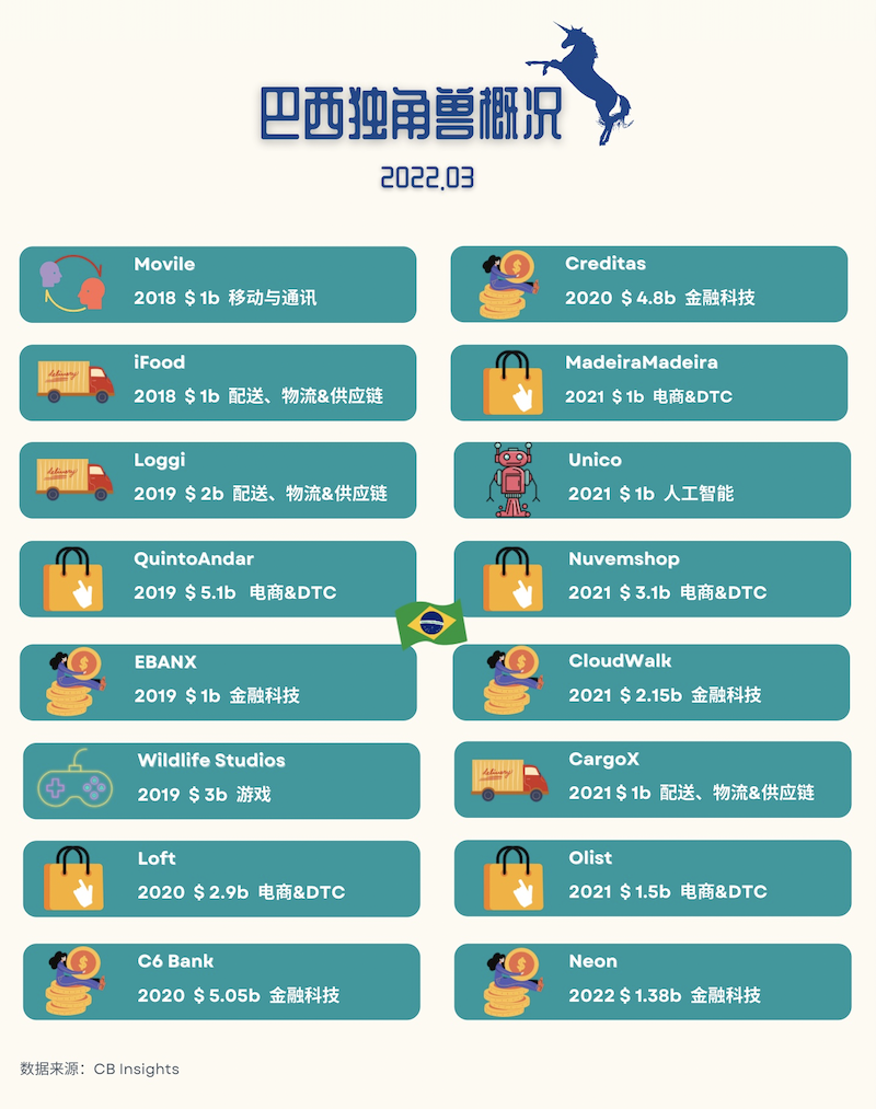 此外,根據(jù) Distrito 的數(shù)據(jù)統(tǒng)計(jì),巴西的金融科技企業(yè)在2021年獲得的投資最多,達(dá)到37億美元。零售初創(chuàng)公司緊隨其后,獲得了13億美元的資金。此外,根據(jù) CB Insights 統(tǒng)計(jì),截至2022年3月,巴西共有16家獨(dú)角獸。