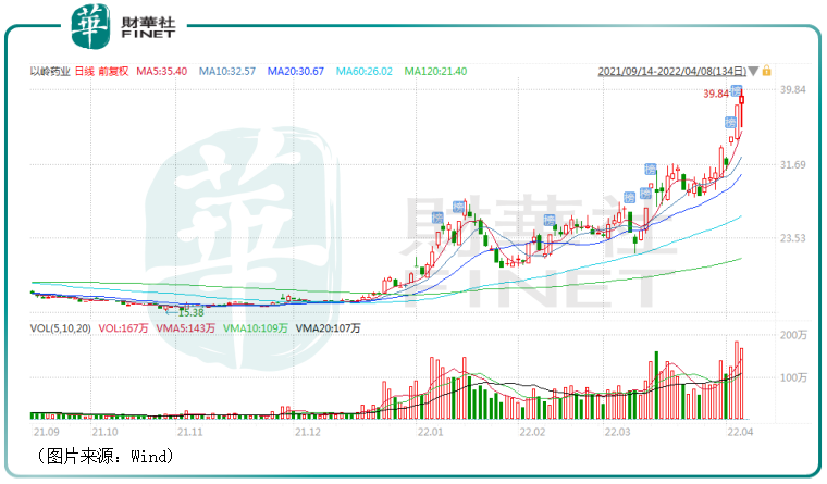 4月8日,以嶺藥業(yè)(002603.SZ)未能再度漲停,但截至收盤其股價(jià)(以下均指前復(fù)權(quán))依然上漲了2.44%,報(bào)收39.09元/股,再度創(chuàng)下了上市新來的新高,總市值也來到了653.08億元。