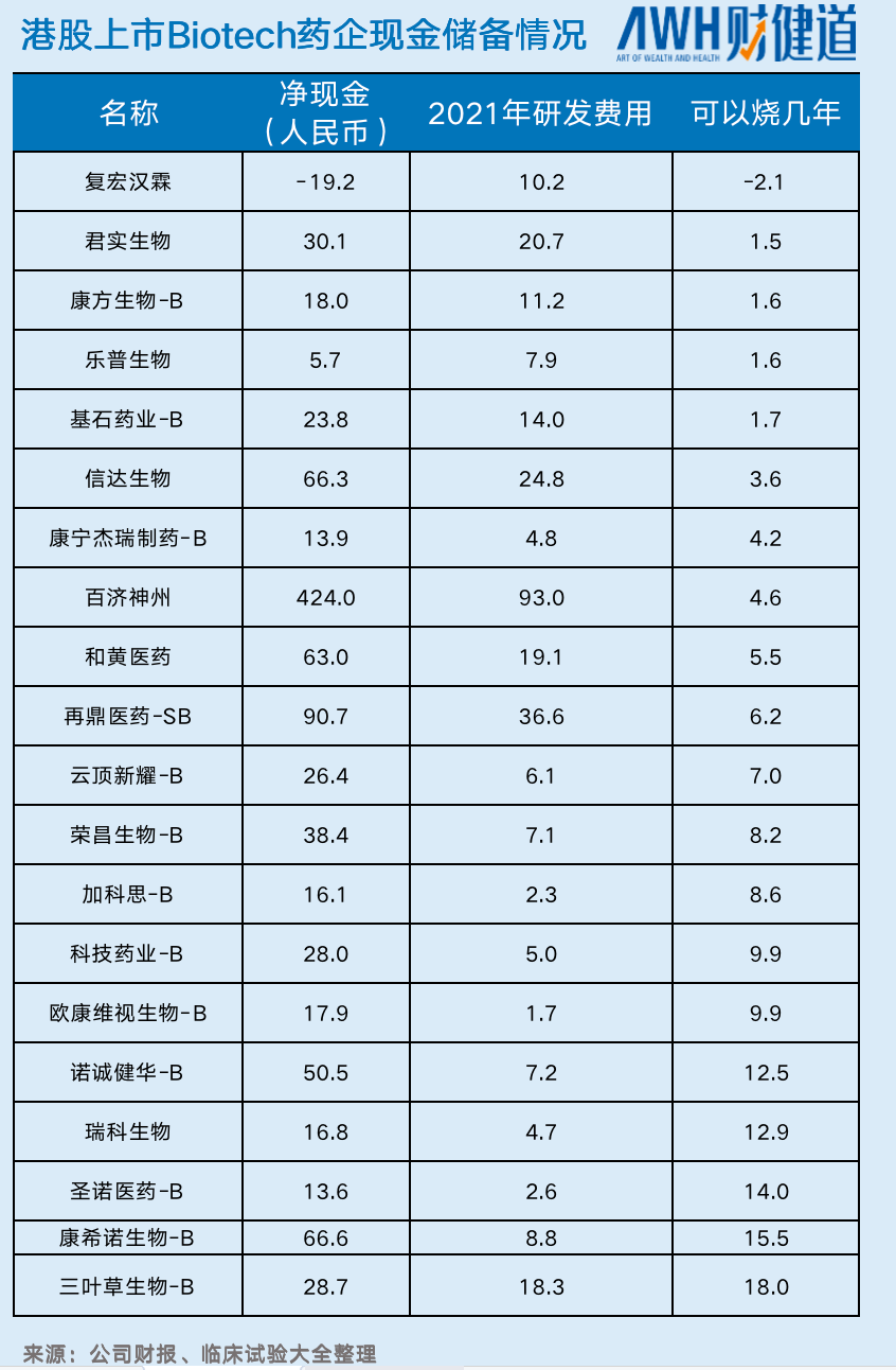 港股18A企業(yè)的現(xiàn)金儲(chǔ)備情況是阿基米德對(duì)這一問(wèn)題的重要判斷依據(jù)之一。對(duì)Biotech來(lái)說(shuō),在資本輸血銳減的局面下,現(xiàn)金儲(chǔ)備顯得十分重要。只有血夠厚——至少能支撐2年以上的研發(fā)支出,才有可能熬過(guò)寒冬。